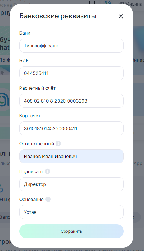 - В «Банковские реквизиты» введите данные расчётного счета.