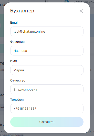 - В «Данные бухгалтера» введите информацию о бухгалтере. Например, если нужно получать счета на его почту.