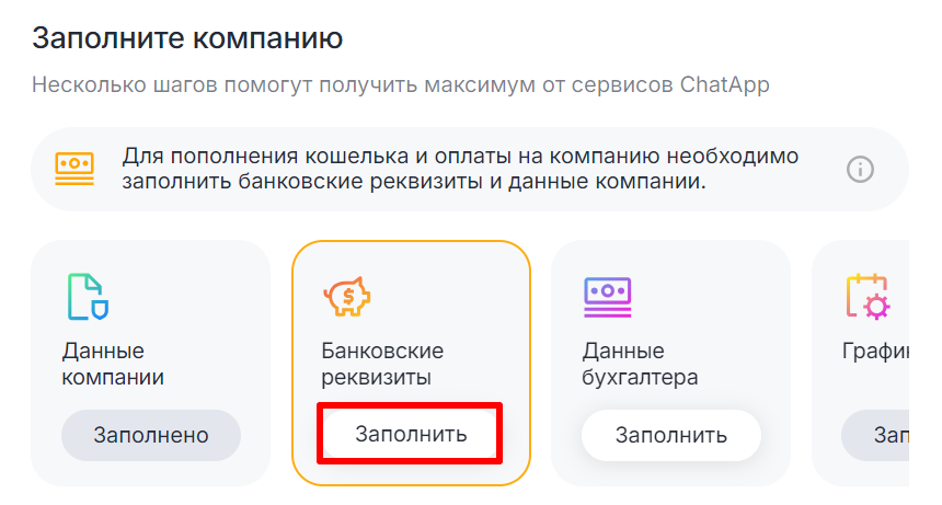 3. Добавьте информацию об организации в разделе «Заполните компанию». Чтобы открыть окно для ввода данных, нажмите на кнопку «Заполнить».