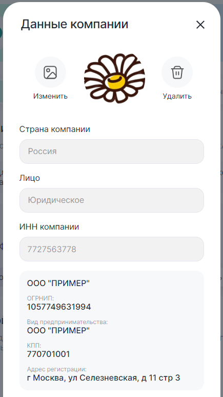 - В «Данные компании» добавьте ИНН и аватар компании для юридического лица.