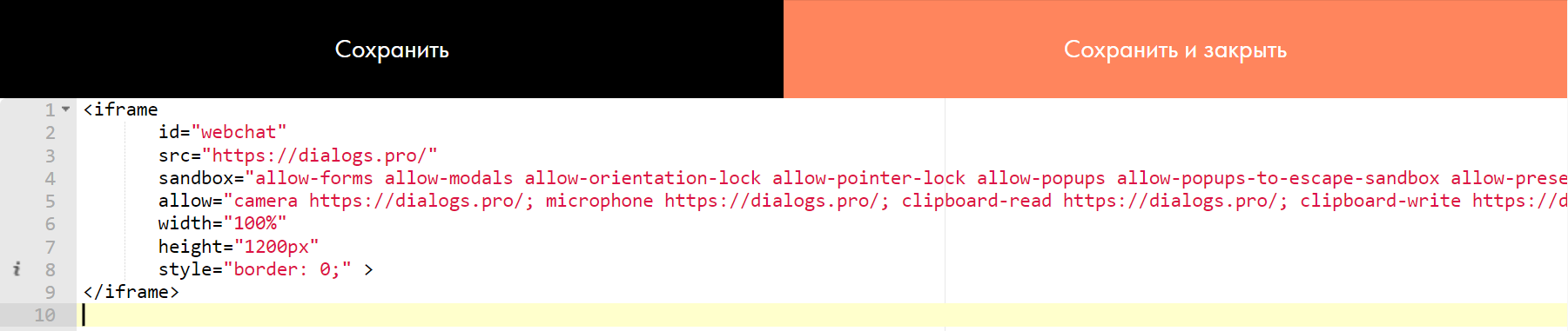 | $query = http_build_query($fields); Код подключения iframe: <iframe id="webchat" src="https://dialogs.pro/?<?=$query?>" sandbox="allow-forms allow-modals allow-orientation-lock allow-pointer-lock allow-popups allow-popups-to-escape-sandbox allow-presentation allow-same-origin allow-scripts allow-top-navigation allow-top-navigation-by-user-activation" allow="camera https://dialogs.pro/; microphone https://dialogs.pro/; clipboard-read https://dialogs.pro/; clipboard-write https://dialogs.pro/" width="100%" height="99%" style="border: 0;" > </iframe> |