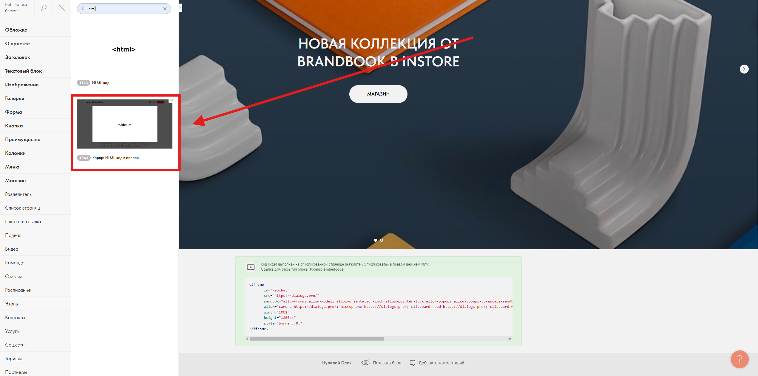3. Добавьте блок HTML, например, «Popup: HTML-код в попапе».