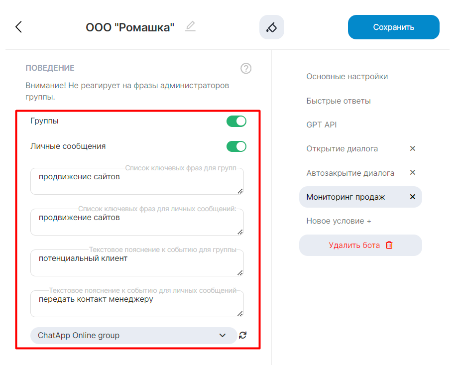 8. Нажмите «Сохранить». Бот соберет все сообщения с ключевыми словами и отправит их в указанную в настройках группу Telegram.
