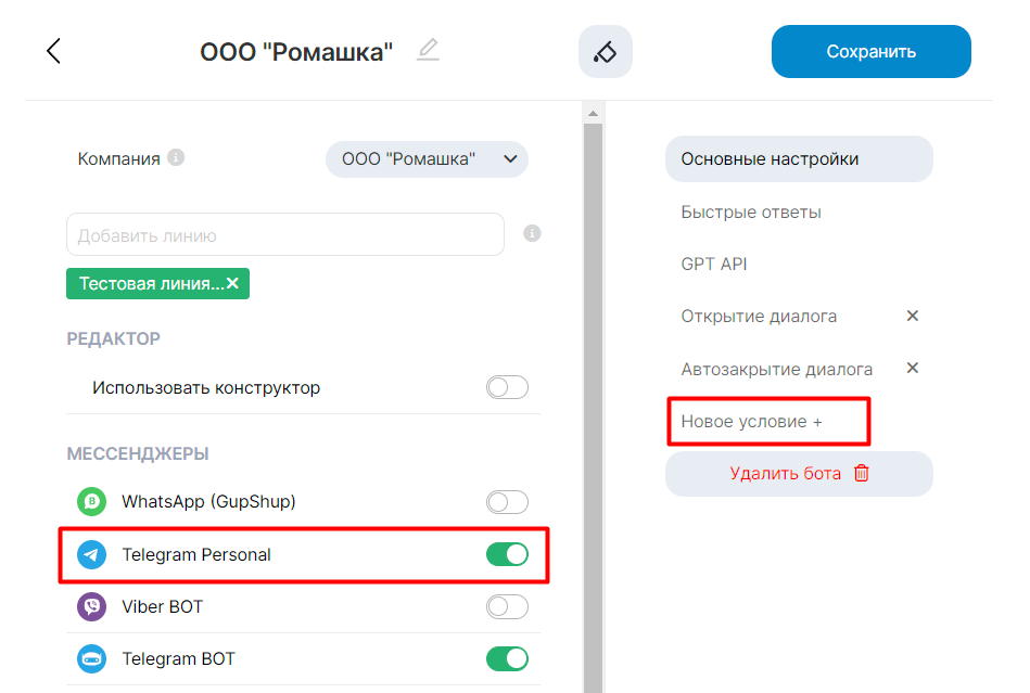 4. Проверьте, что канал Telegram Personal активирован. Зайдите в Основные настройки бота. При этом ползунок «Использовать конструктор» должен быть выключен.