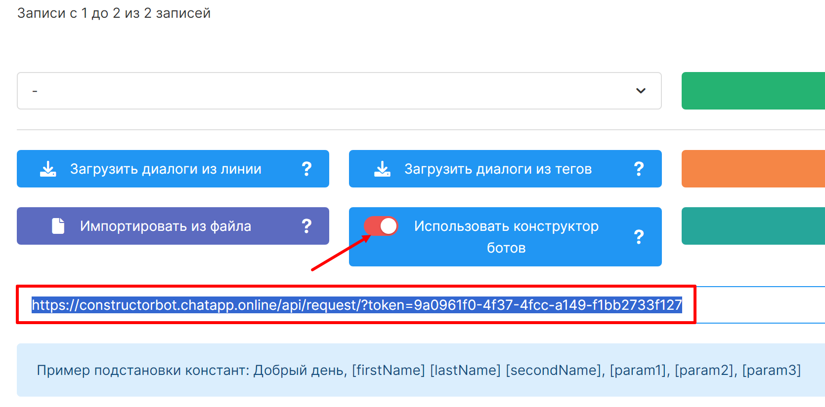 2. Вернитесь в раздел «Рассылки». На главной странице активируйте переключатель «Использовать конструктор ботов» внизу страницы. Вставьте скопированную ссылку вебхука из Конструктора ботов в выпадающее поле.