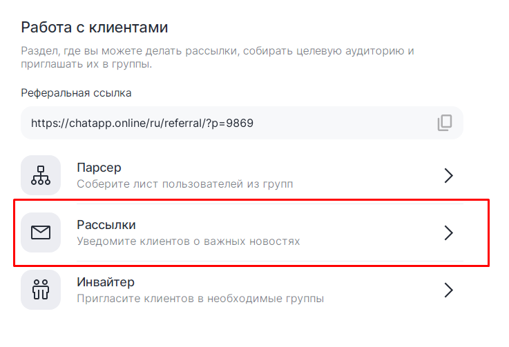 1. Из Личного кабинета перейдите в раздел «Работа с клиентами». Выберите сервис «Рассылки».
