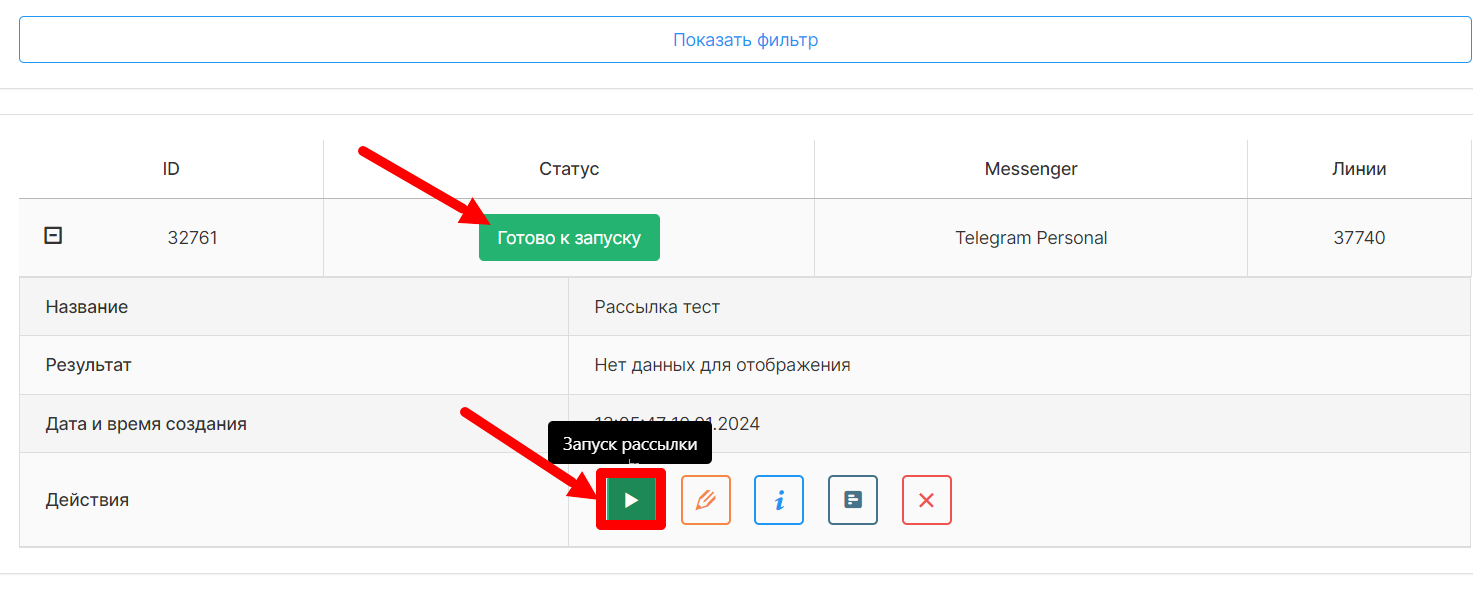 5. Настройте раздел «Рассылки» с выбранным шаблоном. Инструкция по работе с сервисом — в статье Рассылка через мессенджеры - WhatsApp и Telegram.