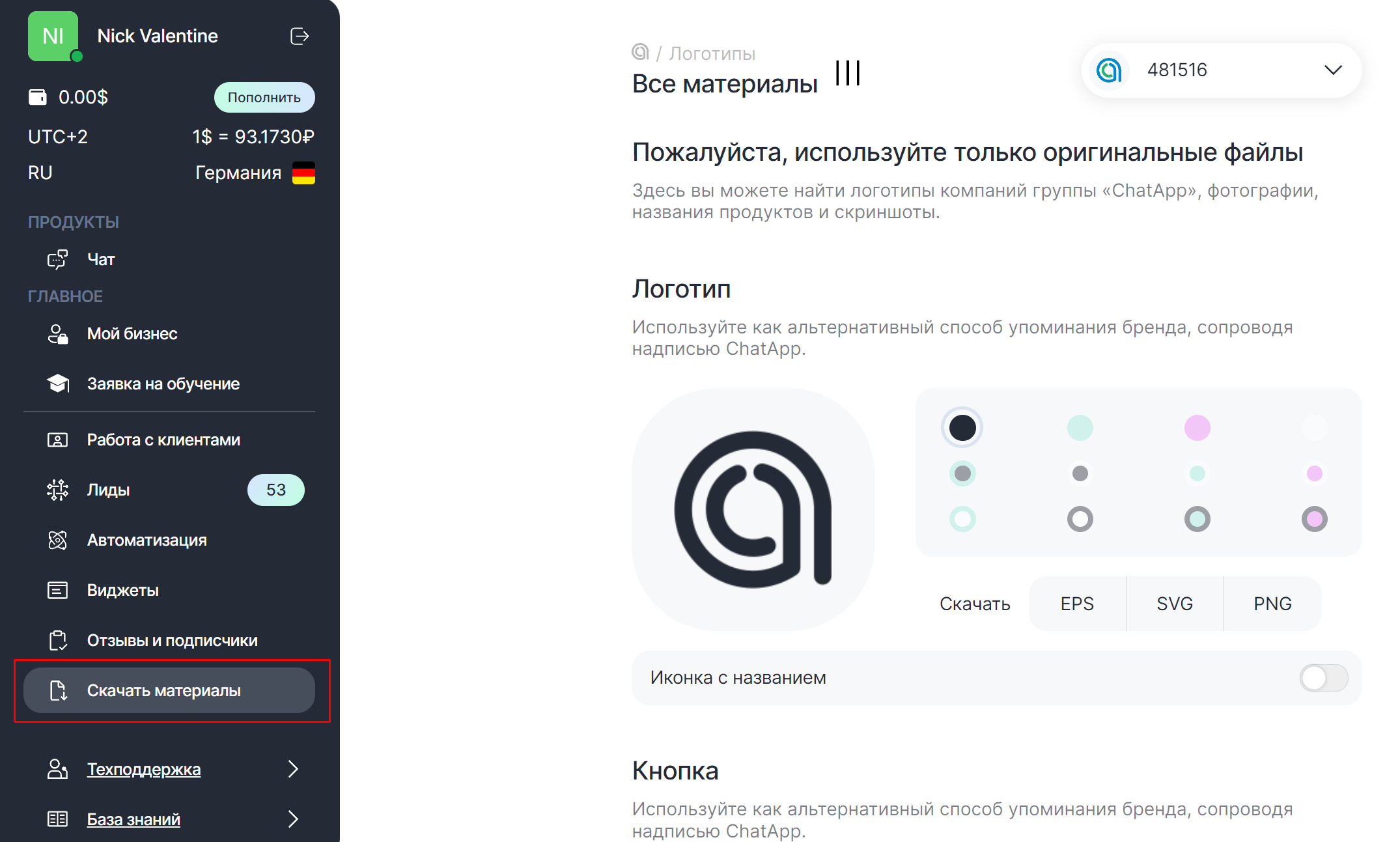 2) Перейдите в раздел «Скачать материалы» в меню слева. Сохраните логотип и разместите у себя на сайте.