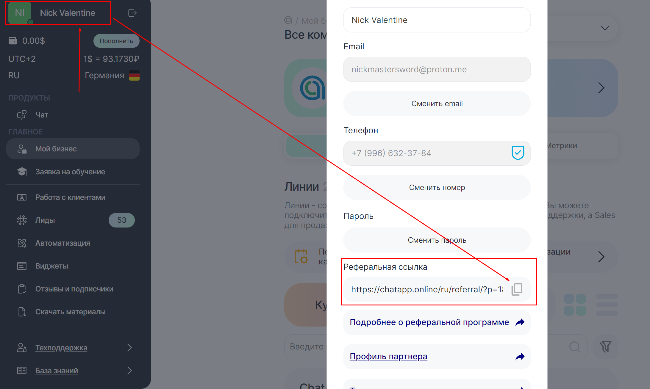 1) Нажмите в меню слева на иконку профиля. Во всплывающем окне в поле «Реферальная ссылка» скопируйте ссылку и разместите ее у себя на сайте.