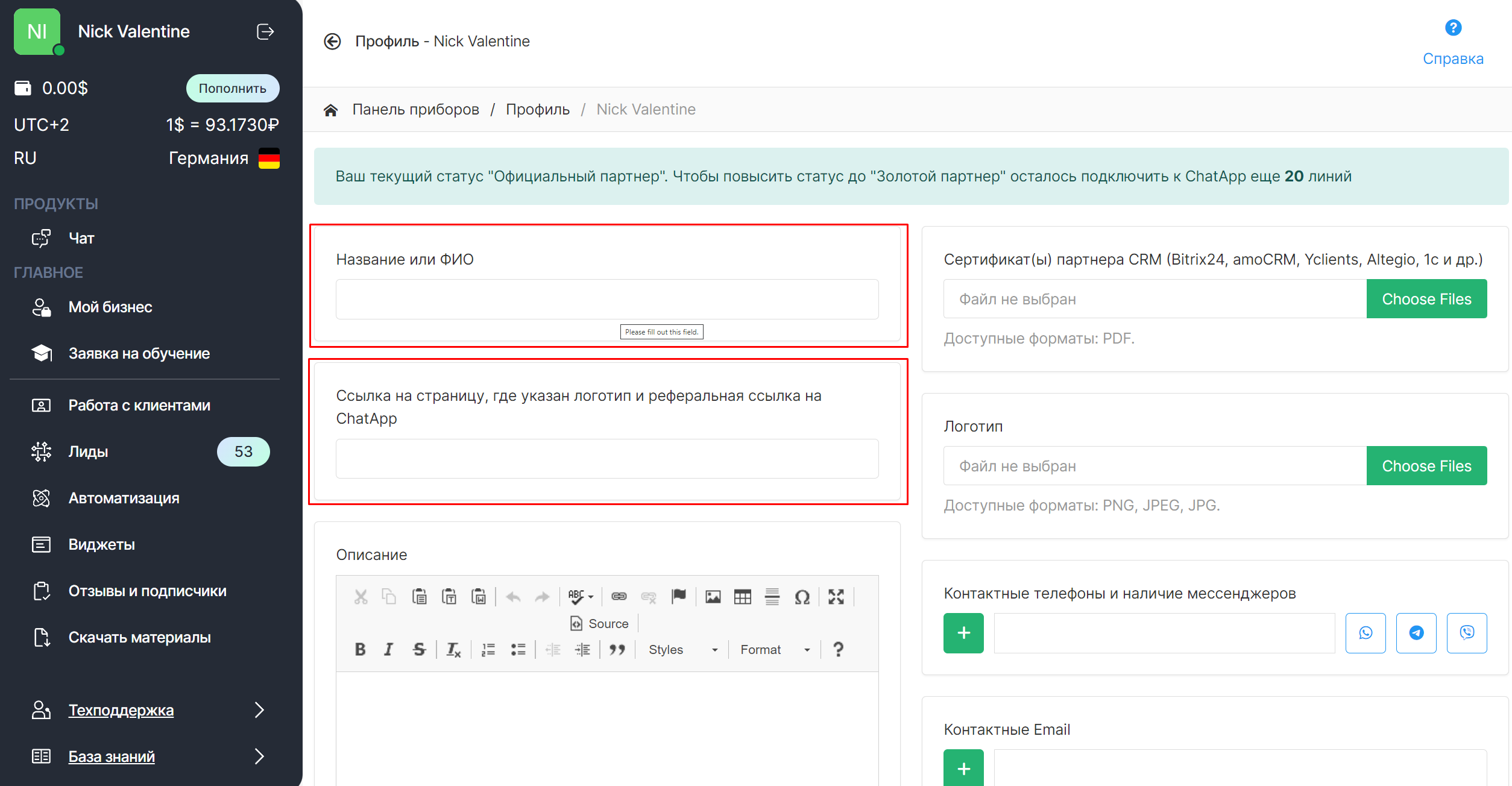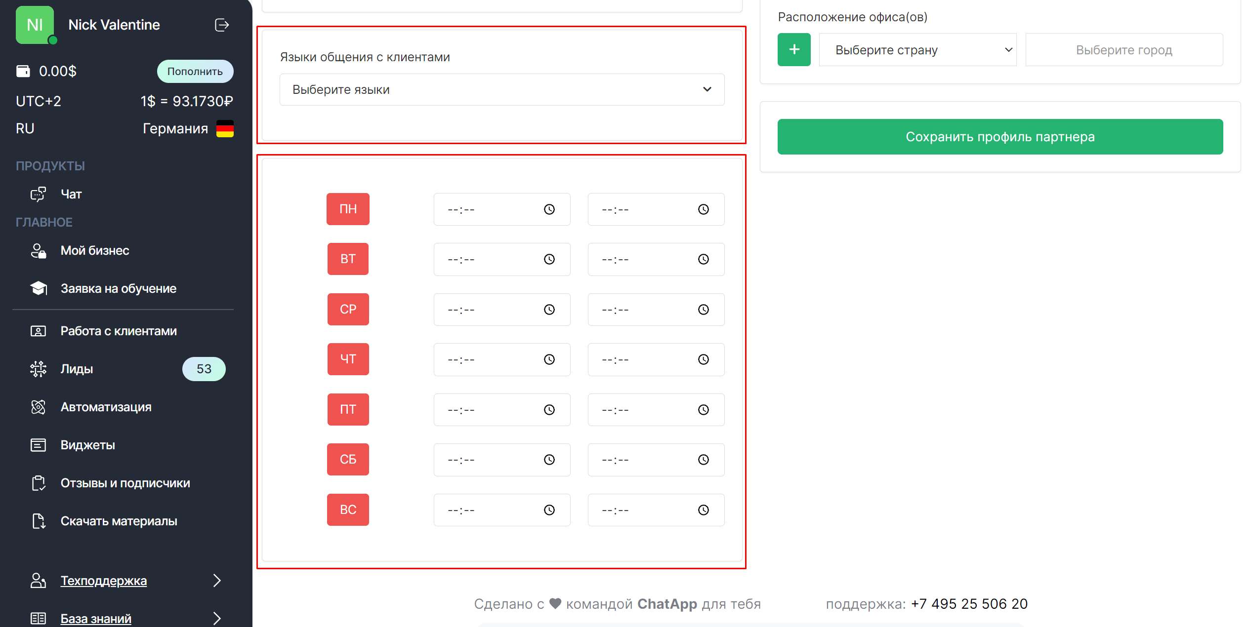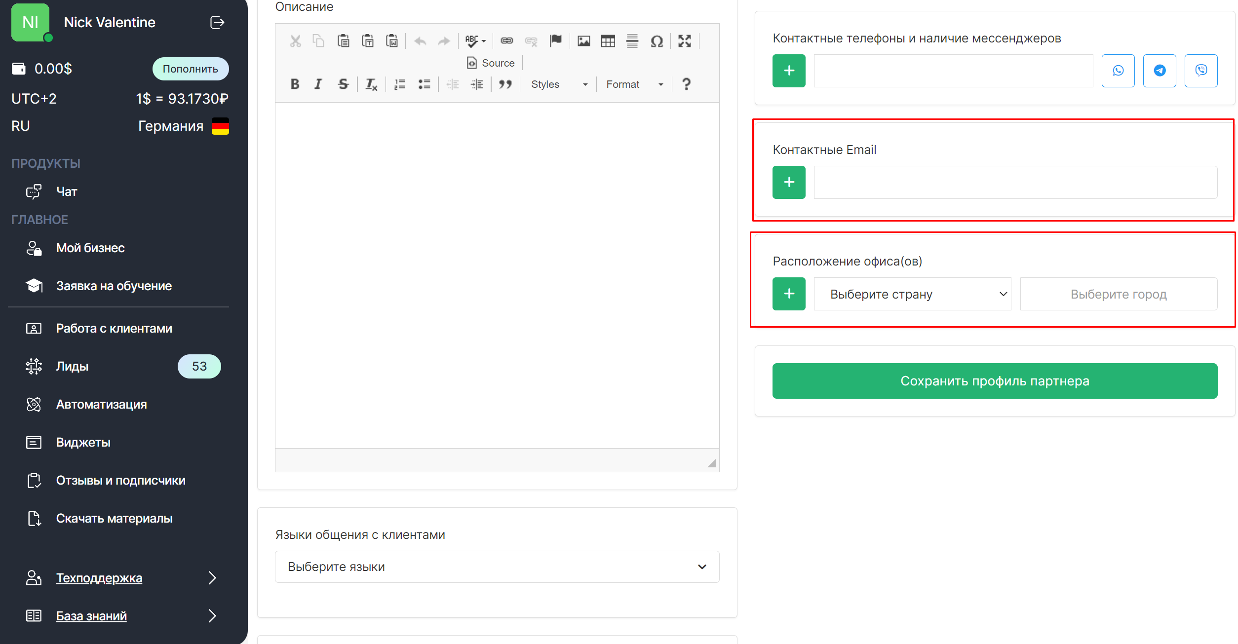 - В профиле партнера добавьте языки общения с клиентами. Так мы сможем направить к вам клиентов,