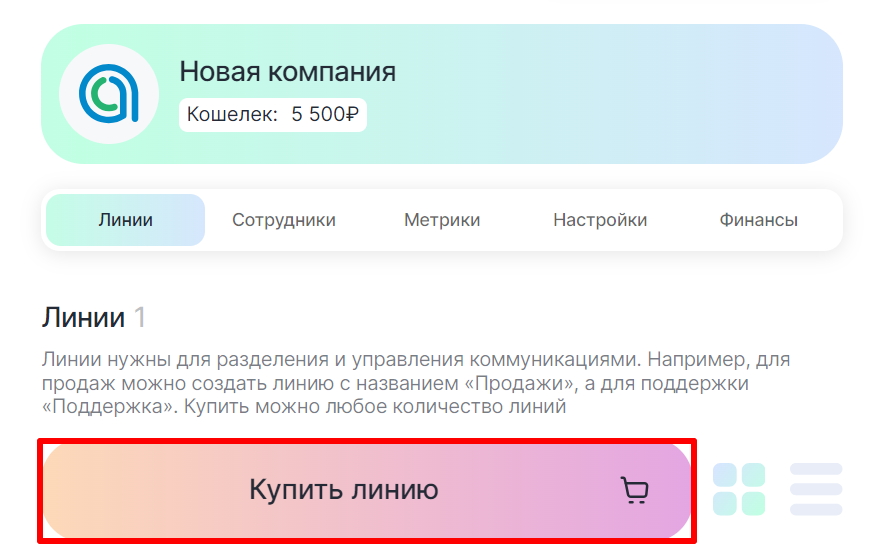 8. Вернитесь в раздел «Выбранная компания» и нажмите «Купить линию»;