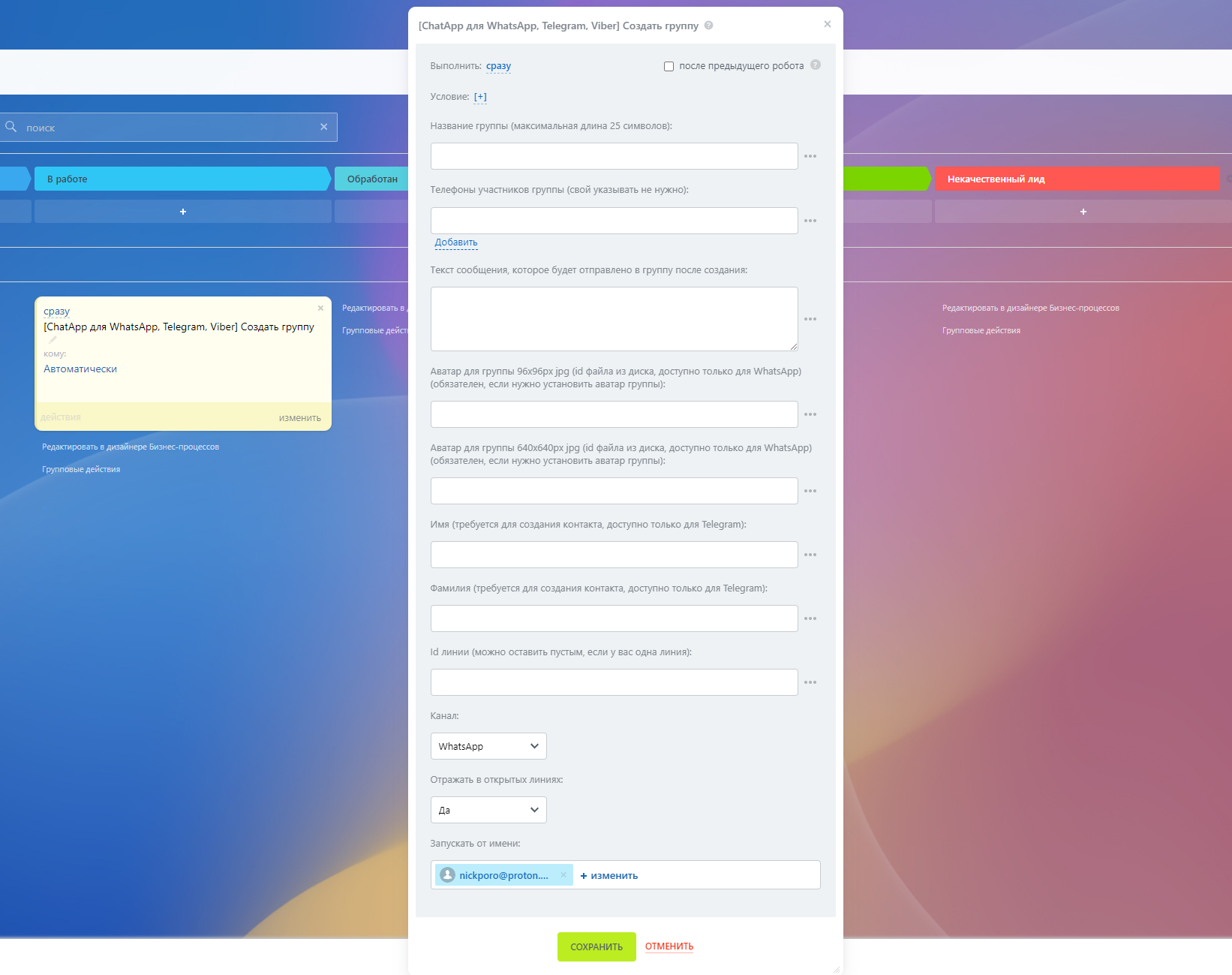 Чтобы после перехода сделки на определенный этап создавалась группа в WhatsApp, в которой будут определённые контакты: