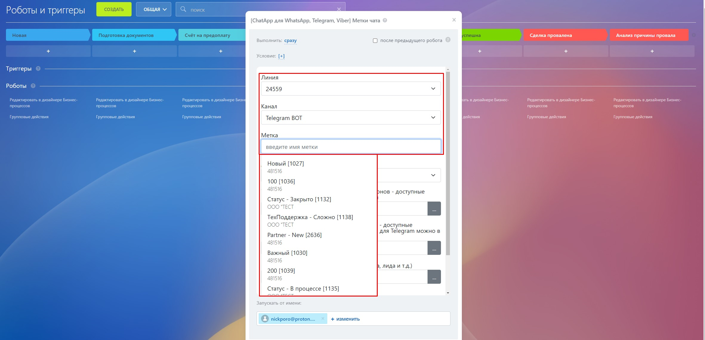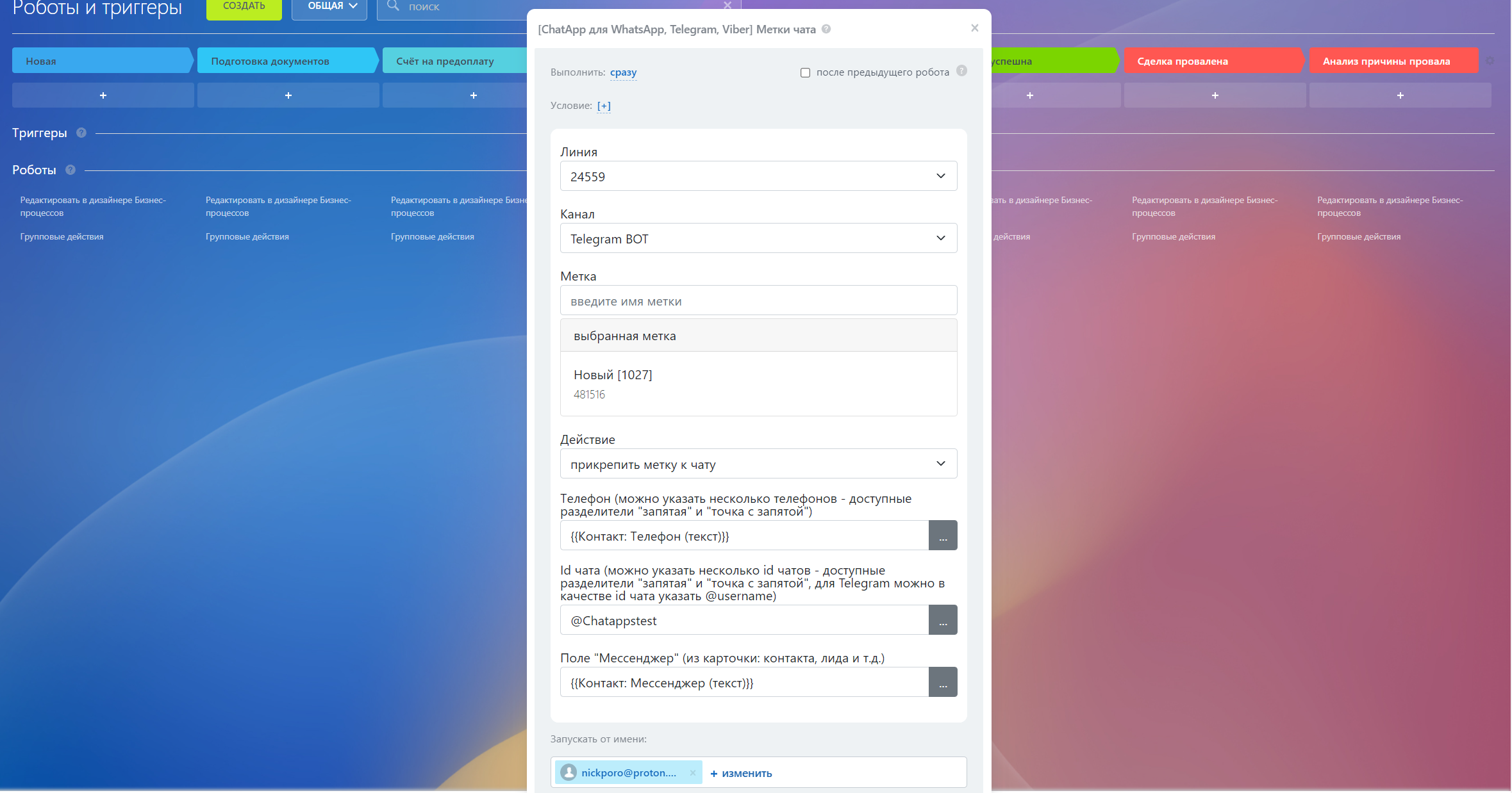 - Добавьте Робота с именем [ChatApp] Метки чата;
