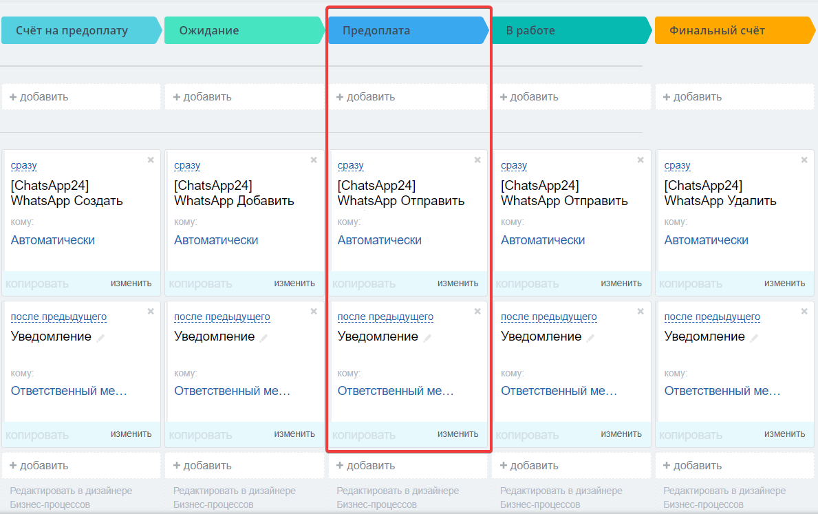 - Добавьте робота ChatApp - Отправить сообщение в сделку, например на стадии Предоплата.
