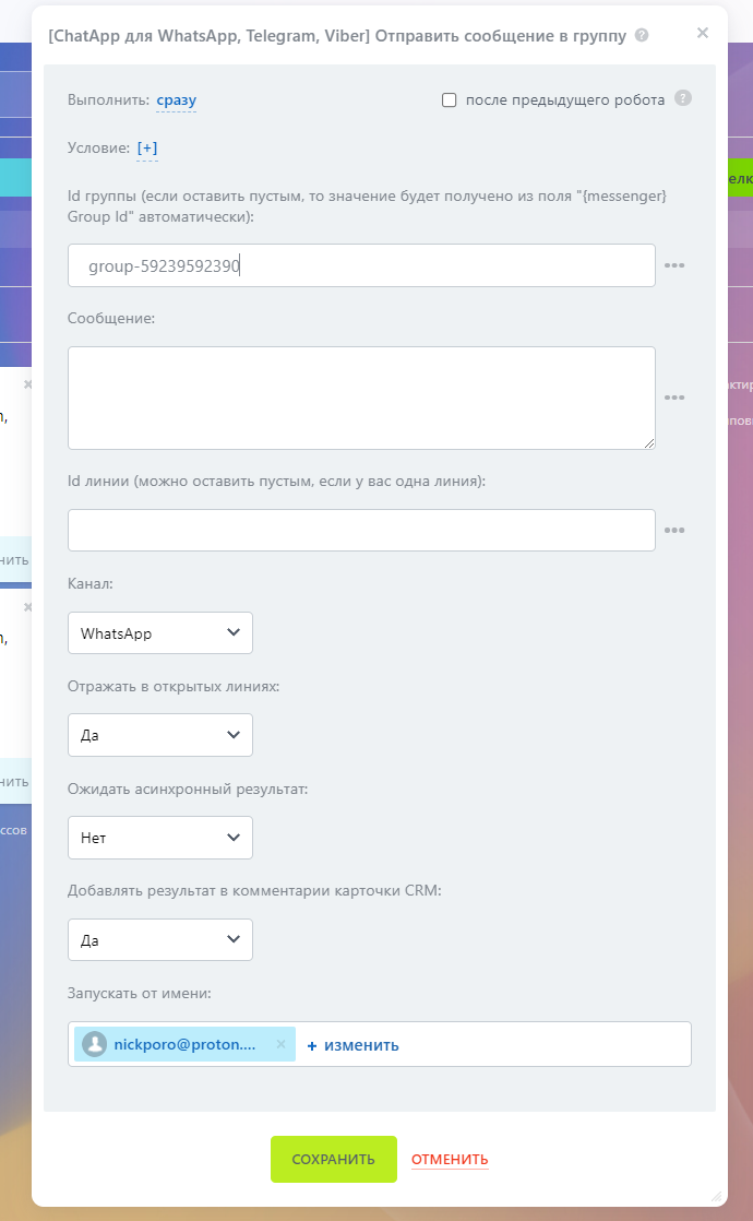 Робот ChatApp - Отправить сообщение автоматически отправляет в группу текстовые сообщения либо сообщения с вложенными документами созданными в CRM.