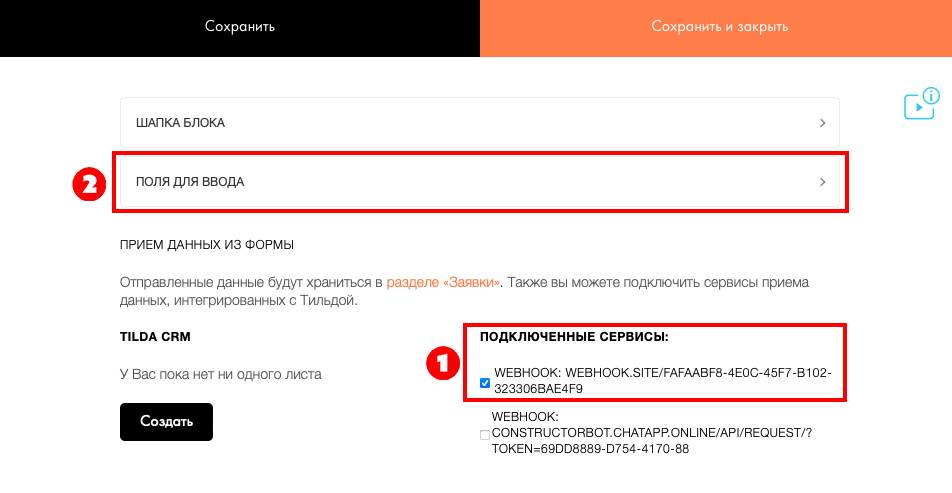 4. В разделе «Подключенные сервисы» отметьте нужный webhook. Перейдите в «Поля для ввода»;