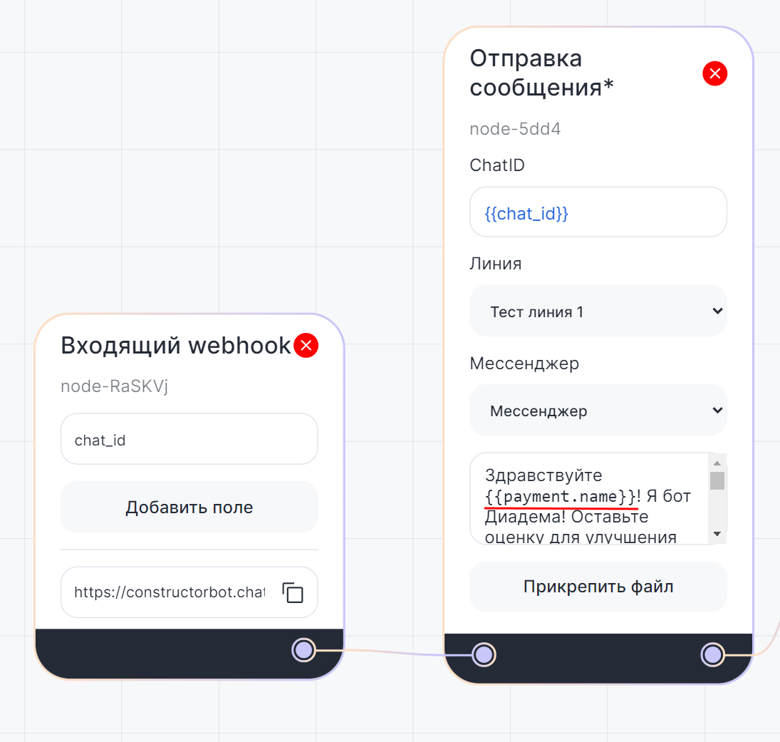 1. Создайте блок «Отправка сообщения*» и свяжите его с блоком «Входящий webhook»;