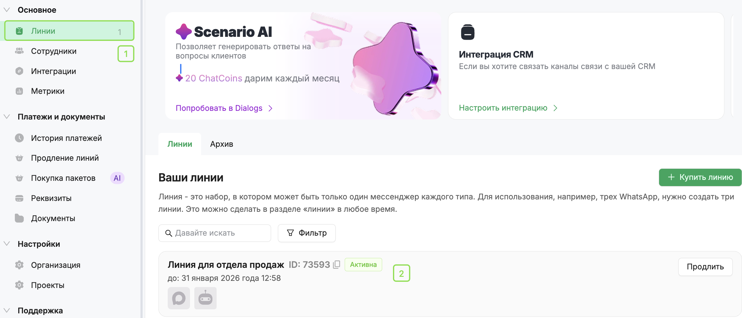 Шаг 1. В личном кабинете откройте раздел «Линии» и выберите линию с каналом Max Bot — откроется окно настроек линии.