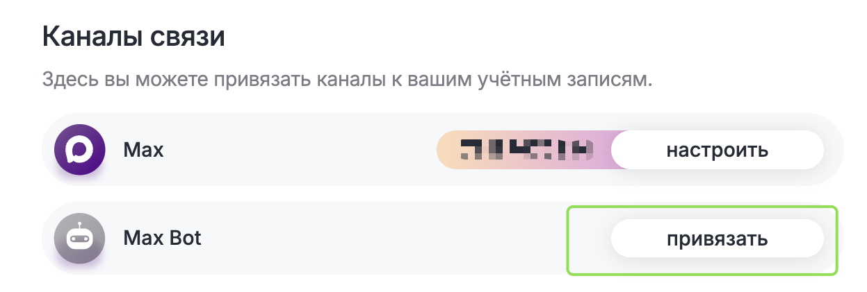 Шаг 2. Нажмите кнопку «Привязать» напротив канала MAX Bot.