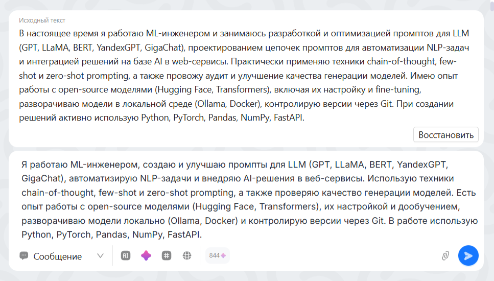 Ассистент изменит текст вашего сообщения в соответствии с выбранным действием.