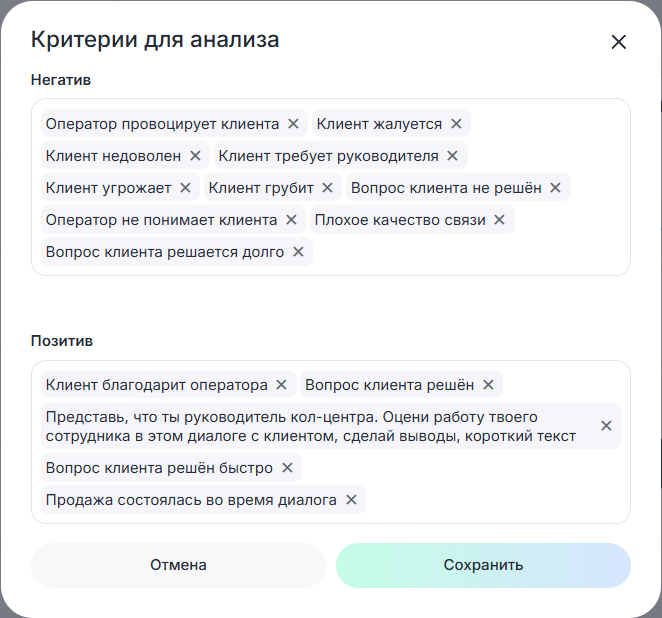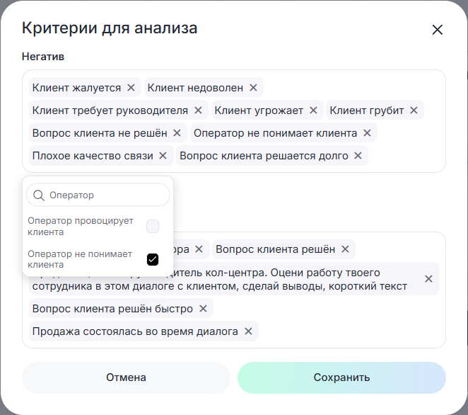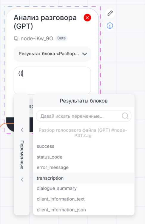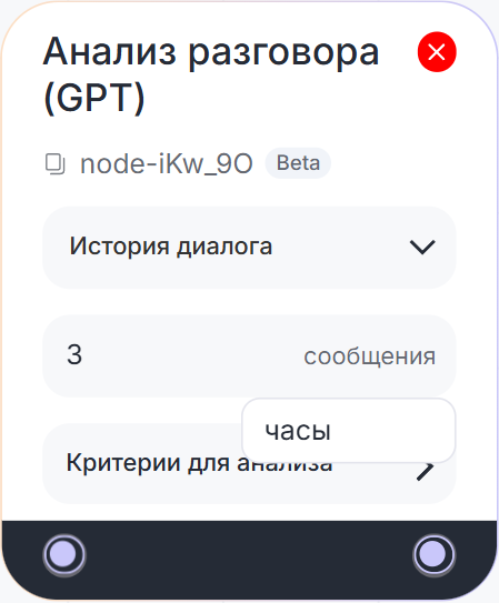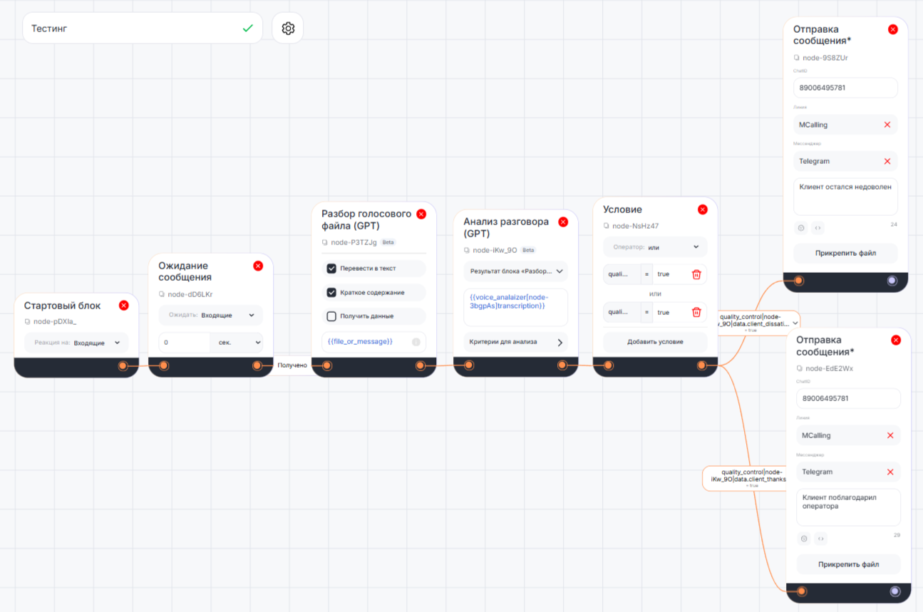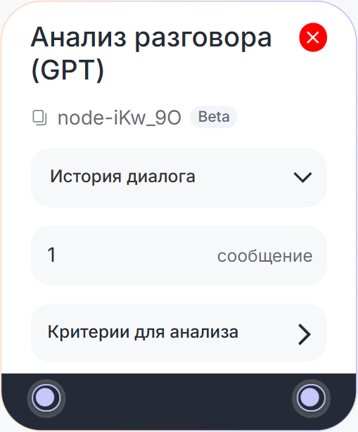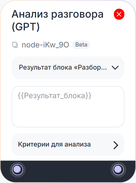 Блок «Анализ разговора (GPT)» анализирует голосовые файлы или переписку с помощью ChatGPT, проверяет на соответствие заданным критериям и передает результат. Может понадобиться, например, чтобы оценивать диалоги менеджеров с клиентами.  Блок может разобрать историю диалога или использовать результаты блока «Разбор голосового файла (GPT)». Для работы блока в боте нужно подключить модель ChatGPT. Как это сделать -- читайте в статье "Подключение GPT". Настройка блока 1. В Редакторе сценариев добавьте блок «Анализ разговора (GPT)» на рабочую область.   2. Если нужно анализировать диалог, выберите «История диалога».   Чтобы установить количество сообщений для анализа, выберите «сообщения» и введите число. Чтобы установить количество часов, за которые пришли сообщения для анализа, выберите «часы» и введите число. 3. Если нужно анализировать результат блока «Разбор голосового файла», выберите пункт "Результат блока «Разбор голосового файла»".   Введите результат блока «Разбор голосового файла» в текстовое поле. Для этого введите две фигурные скобки «{{», выберите «Результаты блоков» — «Разбор голосового файла (GPT)» — «transcription».   4. Чтобы указать список критериев, которые будет анализировать блок, нажмите «Критерии для анализа». Параметры делятся на «Негатив» и «Позитив».   5. Выберите нужные критерии из списка. Если нужно удалить критерий, нажмите крестик рядом с его названием. 6. Чтобы добавить новый критерий, введите его в поле «Добавить критерий» и нажмите клавишу «Enter».   Можно создать любой нужный критерий, который сможет проанализировать ChatGPT. Например, «Оператор грубит». Блок возвратит результат — «True» или «False». 7. После создания списка нужных критериев нажмите «Сохранить». 8. Результаты анализа будут сохранены в переменные, соответствующие заданным критериям — их можно увидеть в результатах блока. Подробнее об использовании результатов блоков читайте в статье "Результаты блоков". Пример сценария в Конструкторе ботов Например, можно создать бот-помощник, чтобы пересылать ему на расшифровку записи разговоров операторов с клиентами и анализировать их. Если клиент недоволен — руководитель получит уведомление в мессенджер. Если клиент благодарит сотрудника, также придет уведомление.   В сценарии на иллюстрации: 1. «Стартовый блок» реагирует на входящее голосовое сообщение с записью разговора с клиентом. 2. Блок «Ожидание сообщения» нужен, чтобы блок «Разбор голосового файла (GPT)» дождался сообщения с записью разговора. 3. Блок «Разбор голосового файла (GPT)» переводит голосовой файл в текст. 4. Блок «Анализ разговора (GPT)» анализирует результаты блока «Разбор голосового сообщения». В блоке установлены два критерия: «Клиент недоволен» и «Клиент благодарит оператора». 5. Блок «Условие» создает два варианта развития сценария: если по результатам анализа критерий «Клиент был недоволен» верен, блок «Отправка сообщения*» присылает руководителю сообщение «Клиент был недоволен». Если по результатам анализа верен критерий «Клиент благодарит оператора», то второй блок «Отправка сообщения*» присылает руководителю сообщение «Клиент поблагодарил оператора».