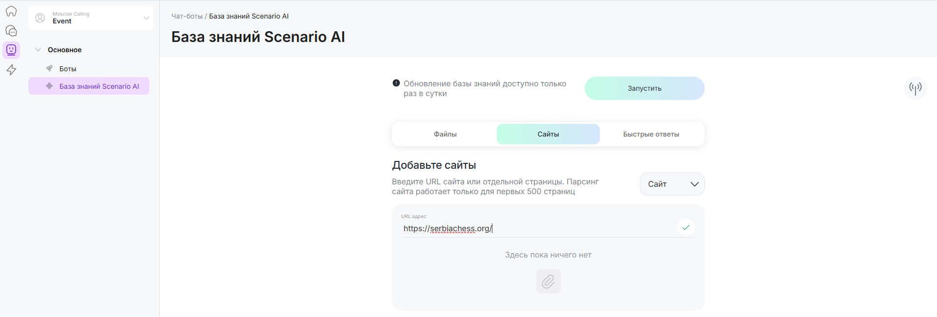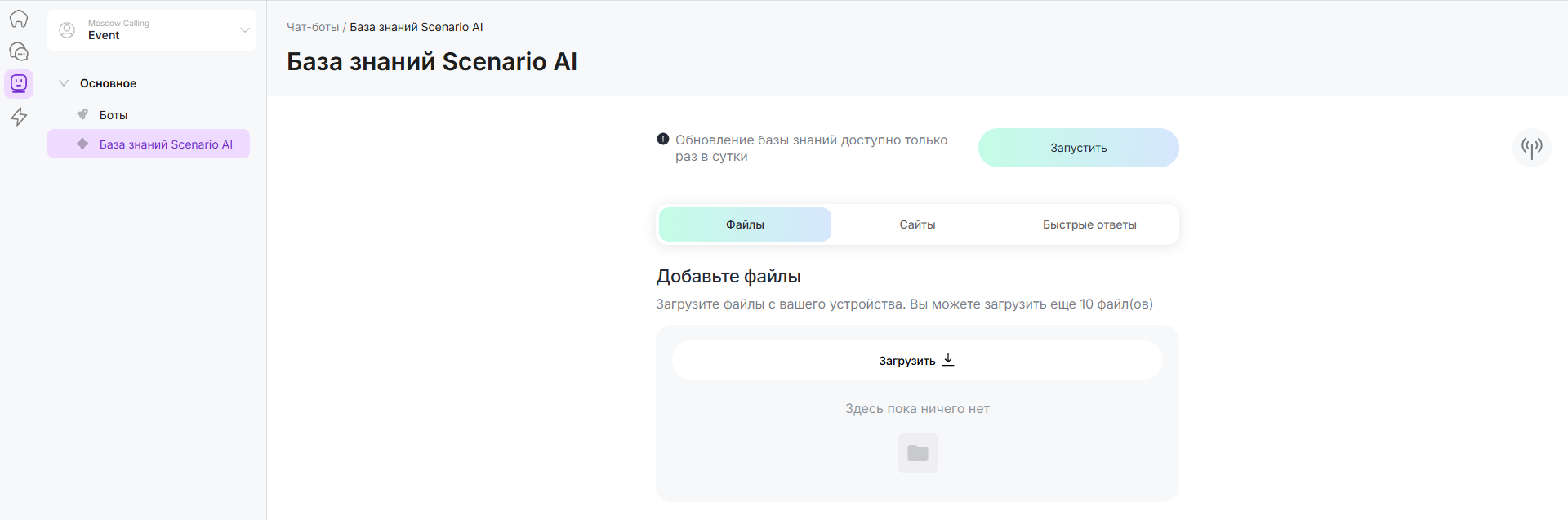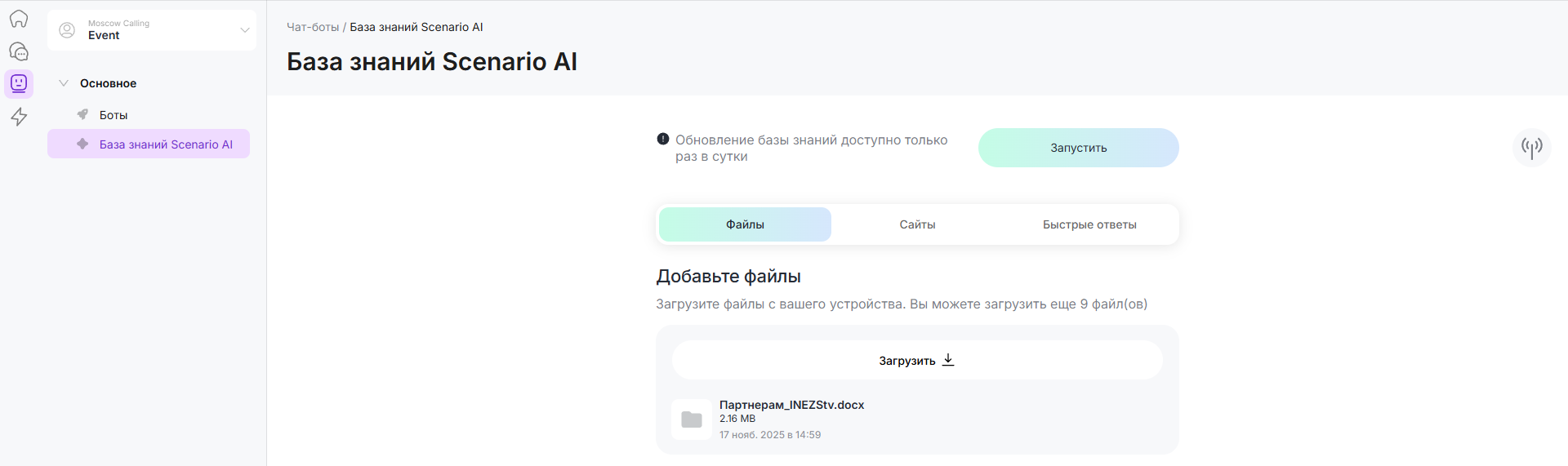 Важно: обновление базы знаний Scenario AI составляет 5 ЧатКоинов.