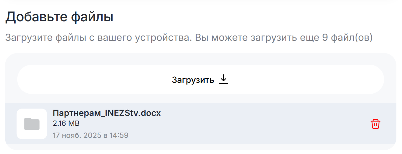 1. Откройте вкладку "Файлы". 2. Нажмите на кнопку «Загрузить». 3. Выберите нужный файл в формате .txt, .doc, .docx, .pdf.