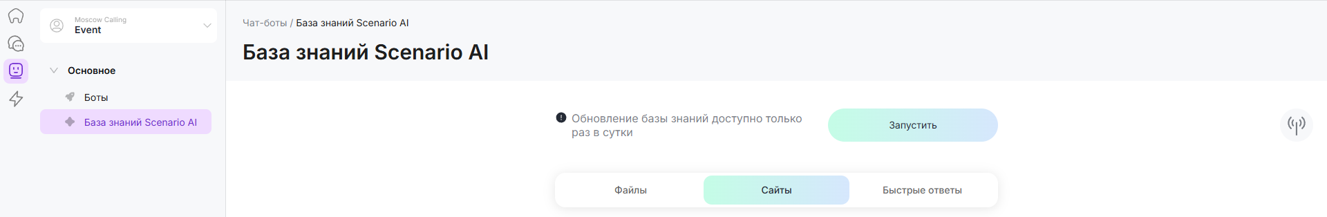 3. В левом меню страницы выберите раздел "База знаний Scenario AI".
