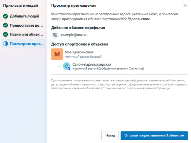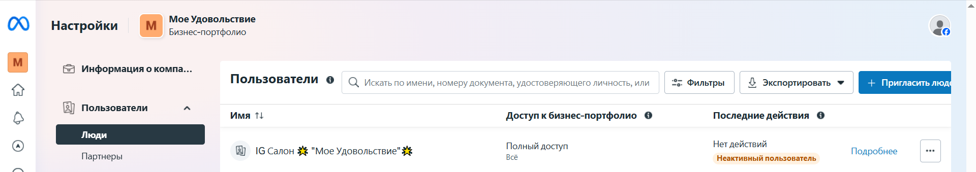 Meta отправит сотруднику приглашение на почту. Ему надо перейти по ссылке, авторизоваться в нужной странице Facebook, заполнить форму, и ваше приглашение будет принято. После его принятия сотрудник отобразится в списке ваших сотрудников.