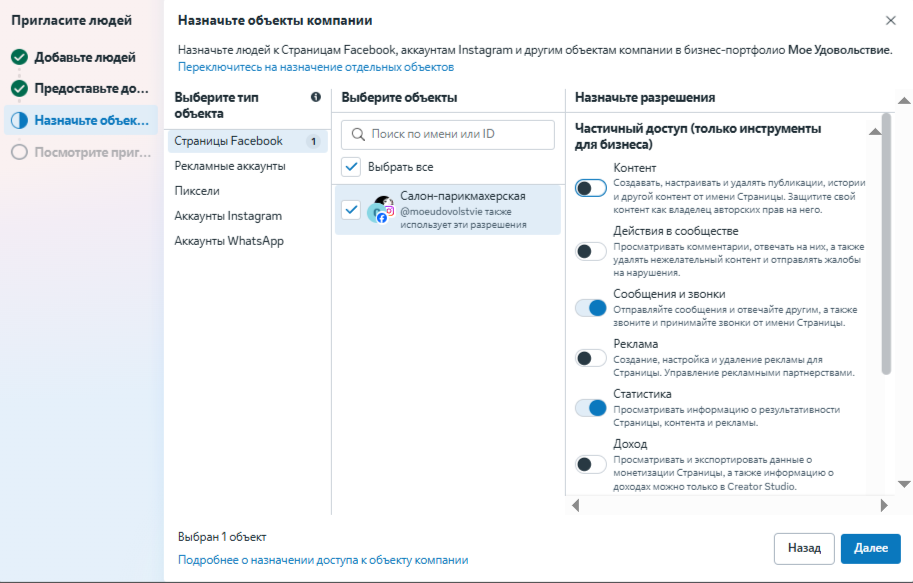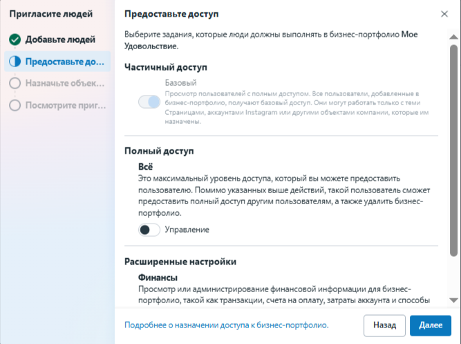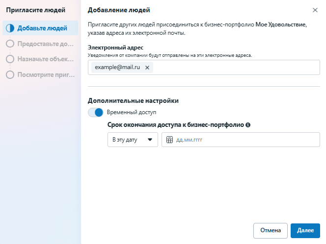 Введите email приглашаемого сотрудника и предоставьте постоянный или временный доступ к компании. Это может быть любой email, не обязательно привязанный к аккаунту в Facebook. Нажмите на кнопку «Далее».