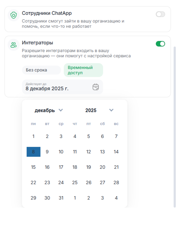 • Для временного доступа выберите поле "Временный доступ". Выберите дату календаря, когда Партнер может входить в ваш Личный кабинет.