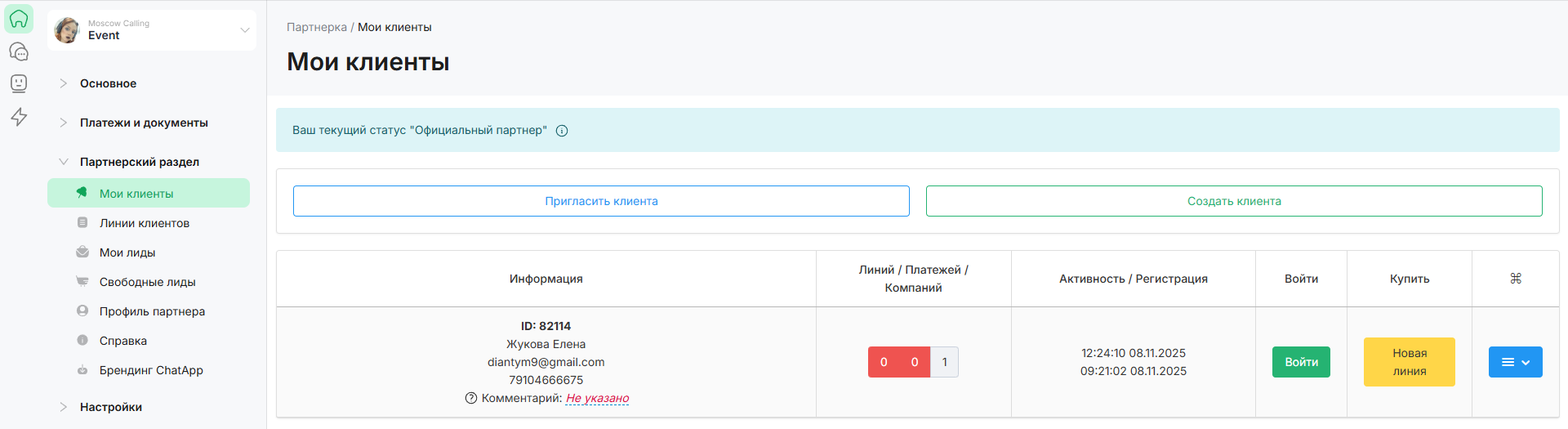 После предоставления клиентом доступа в свой Личный кабинет: 1. Войдите в раздел "Мои клиенты" левого меню страницы своего Личного кабинета Партнера.
