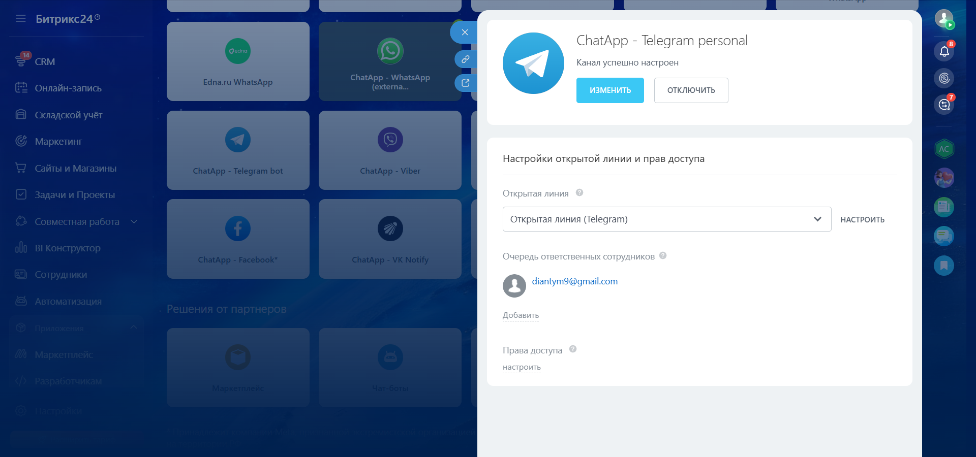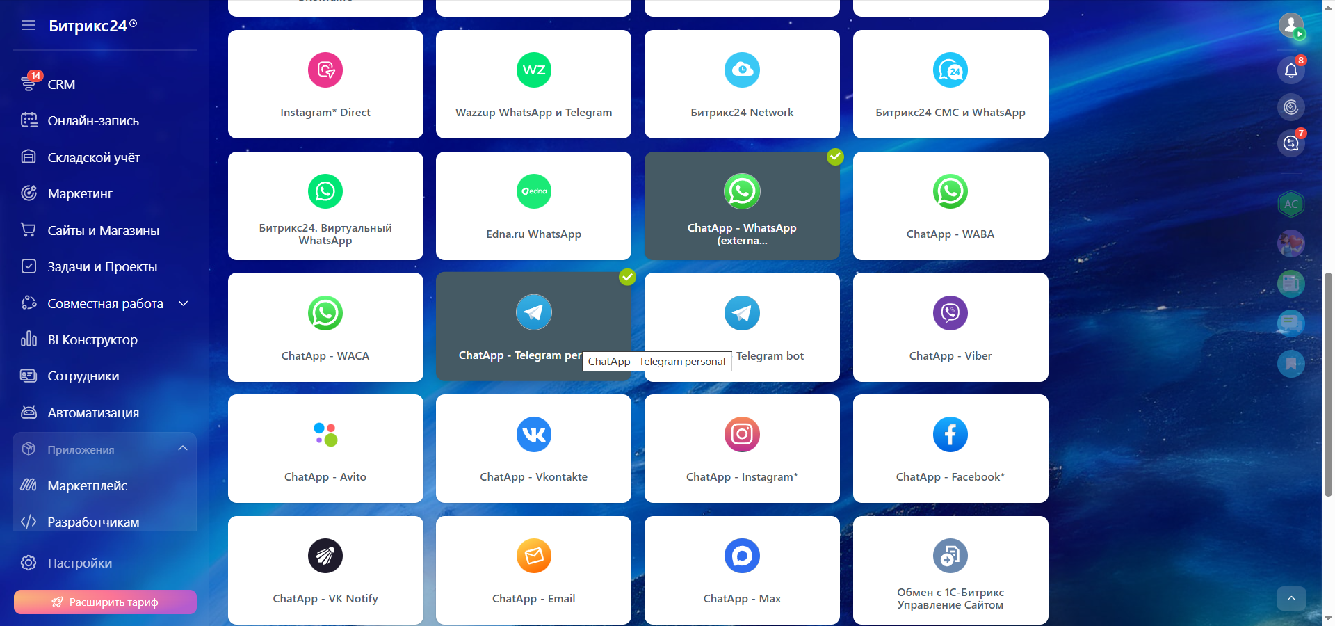 1. Зайдите в Контакт-центр Битрикс24 и выберите коннектор «ChatApp – Telegram personal».