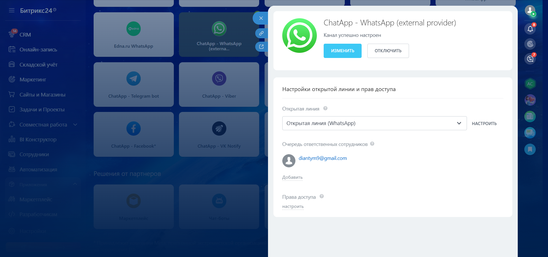 1. Зайдите в Контакт-центр Битрикс24 и выберите коннектор «ChatApp – WhatsApp (external provider)».