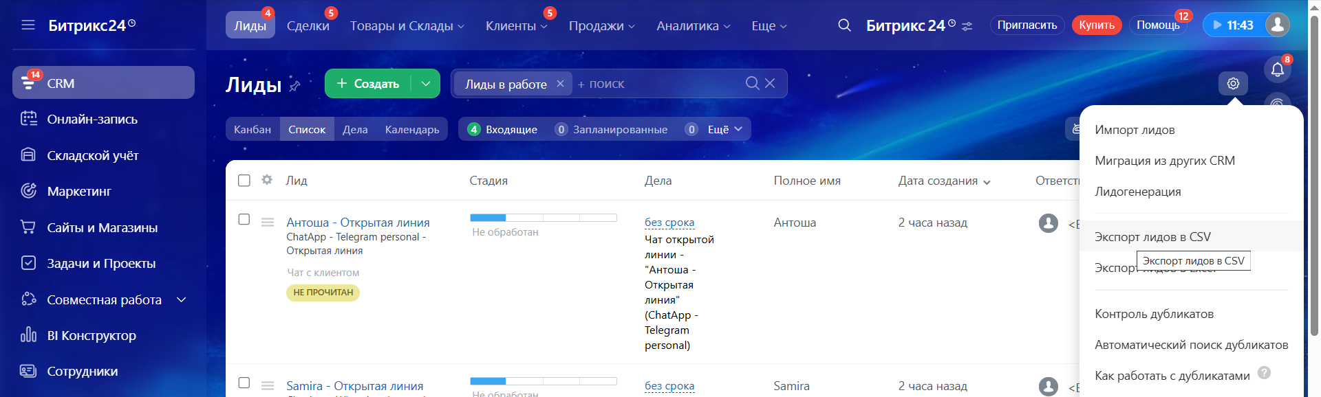 Экспорт контактов из Лидов может потребоваться, когда отсутствуют карточки сделок с отдельными контактами.