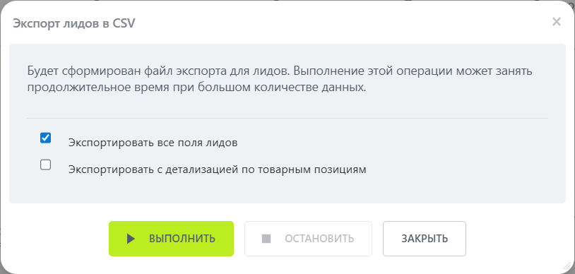 4. Во всплывающем окне установите галочку напротив пункта «Экспортировать все поля лидов» и нажмите на кнопку «Выполнить».