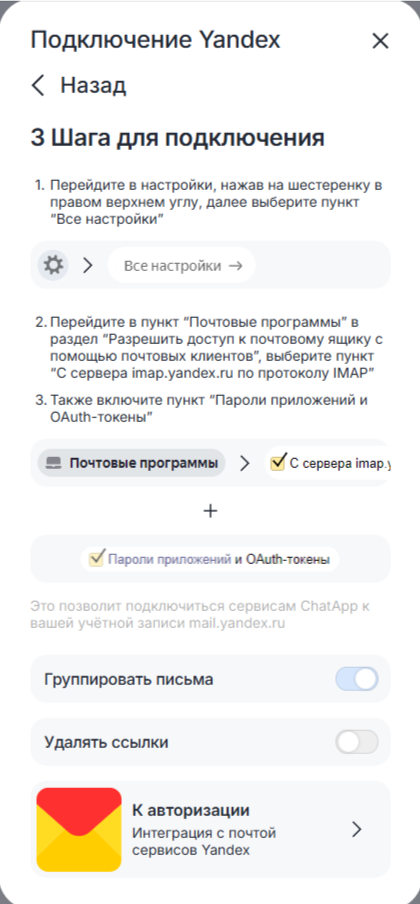 1. Выполните предварительную настройку сервиса в почтовом клиенте Yandex согласно инструкции в открывшейся форме.