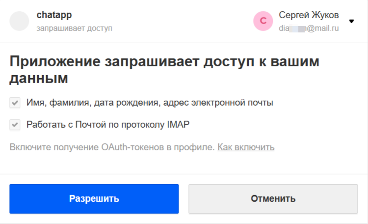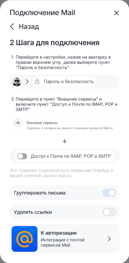 1. Выполните предварительную настройку сервиса в почтовом клиенте Mail согласно инструкции в открывшейся форме.