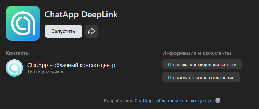 Глубокая ссылка на чат сообщества Вконтакте Приложение ChatApp DeepLink позволяет создавать глубокие ссылки на чат с сообществом ВКонтакте. Чтобы получить глубокую ссылку: 1. Установите приложение для Вконтакте по ссылке — ChatApp DeepLink. Аккаунт должен быть привязан к странице сообщества.   Нажмите «Запустить». 3. Выберите нужное сообщество   и нажмите «Добавить» в правом нижнем углу. 4. Разрешите отправку сообщений и перейдите в свое сообщество Вконтакте.   4. Создайте глубокую ссылку для перехода в чат с нужным сообществом. Пример: https://vk.com/app51848985_-212374484#start=999 Ссылка состоит из нескольких частей: Если в прямой ссылке на сообщество вместо ID указано имя, откройте «Все чаты» сообщества — в адресе появится нужное ID. Например: https://vk.com/gim150834940. Цифры в конце адреса 150834940 — это ID. Когда глубокая ссылка будет готова, ее можно добавить в сценарий чат-бота. 5. При переходе по глубокой ссылке через диалоги ChatApp откроется чат сообщества Вконтакте, куда бот отправит сообщение клиенту. Добавление глубокой ссылки в Конструктор ботов ВКонтакте 1. В Редакторе сценариев добавьте блок «Реакция на фразу» и введите ключ-фразу из глубокой ссылки — #start=999 (она будет одинаковой для любых сообществ Вконтакте).   2. Когда клиент перейдет по глубокой ссылке, блок «Реакция на фразу» получит ключ «/start 999» и бот автоматически отправит сообщение клиенту в чате сообщества Вконтакте. Например: В Telegram Bot В Редакторе сценариев добавьте блок «Реакция на фразу» и введите ключ-фразу из глубокой ссылки. Например, «primer2».   Когда клиент перейдет по глубокой ссылке, блок «Реакция на фразу» получит ключ «primer2». Клиент запустит диалог с Telegram Bot и чат-бот автоматически отправит сообщение из сценария.