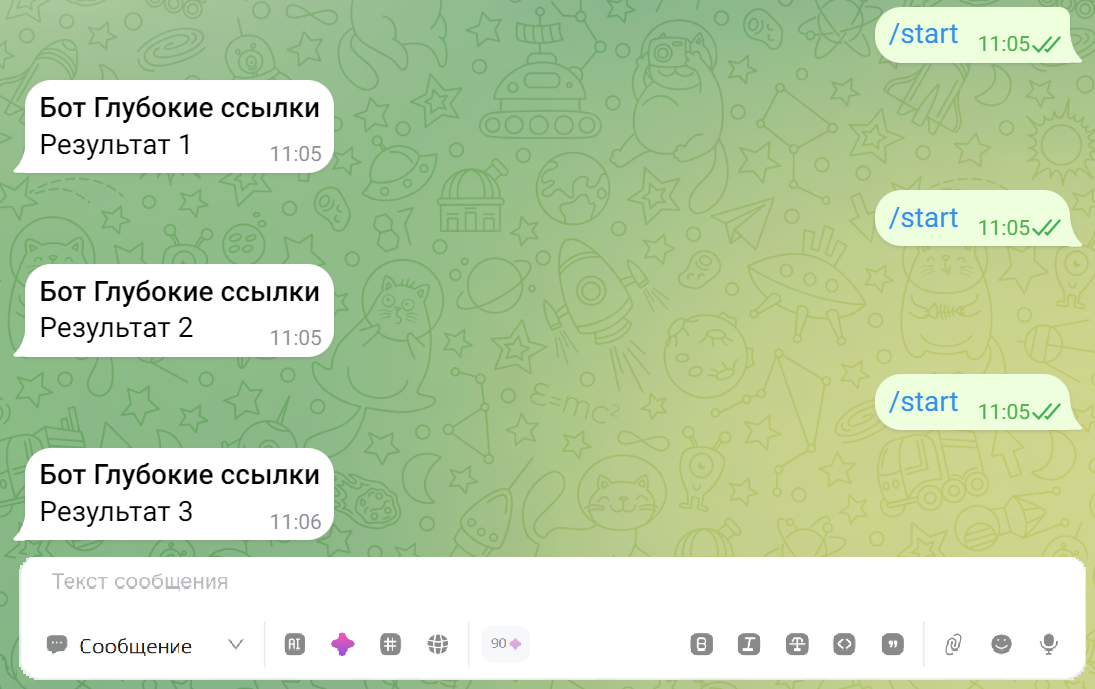 Для сообществ Вконтакте ключ всегда будет одинаковым — #start=999. Для других каналов используются уникальные ключи. Глубокая ссылка на Telegram Bot 1. Скопируйте ссылку на нужный канал Telegram Bot. Вид ссылки в адресной строке:   2. Добавьте в конце ссылки ключ. Пример приведен в таблице:
