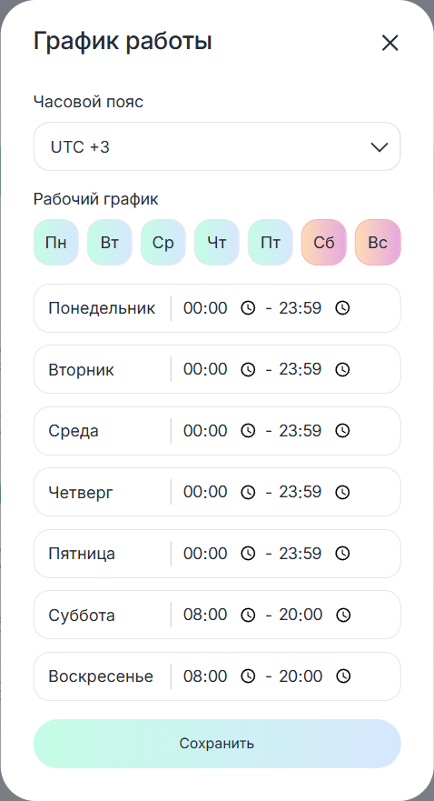 Для того, чтобы бот мог обрабатывать сообщения клиента, поступившие в нерабочее время на линию вашего Проекта, необходимо настроить график работы.