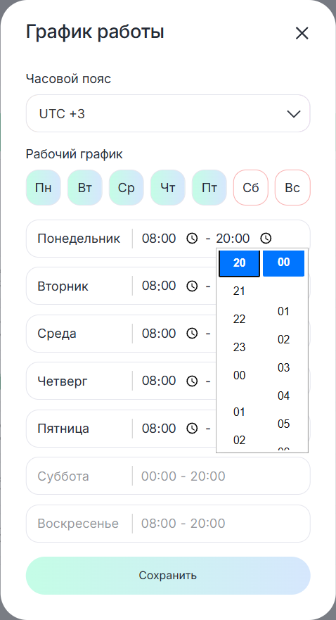 5. Выставьте рабочие часы и нажмите «Сохранить». Время работы можно ввести как вручную, так и через кнопку.