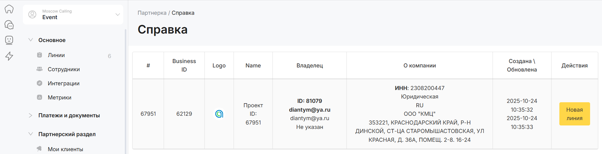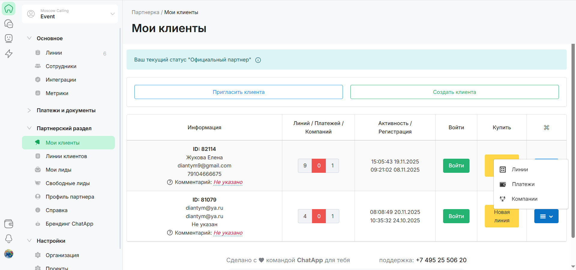 2. По кнопке «Войти» вы можете войти в Личный кабинет клиента, если он предоставил вам доступ, по кнопке «Новая линия» — купить ему новую линию. Как это сделать — читайте в статьях “Доступ к Личному кабинету клиента” и “Покупка линии клиенту“.