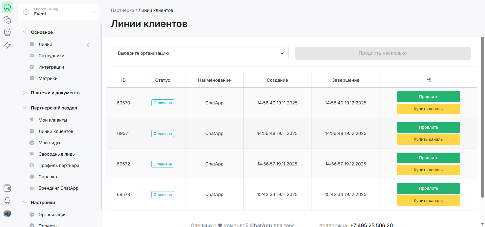 1). Линия — просмотреть линии выбранного клиента и их статус.