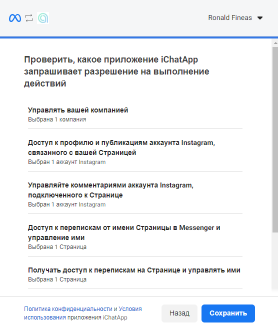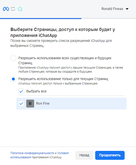 7. Выберите бизнес-аккаунт Instagram*, который подключаете к линии и нажмите «Продолжить». Можно выбрать сразу несколько аккаунтов.