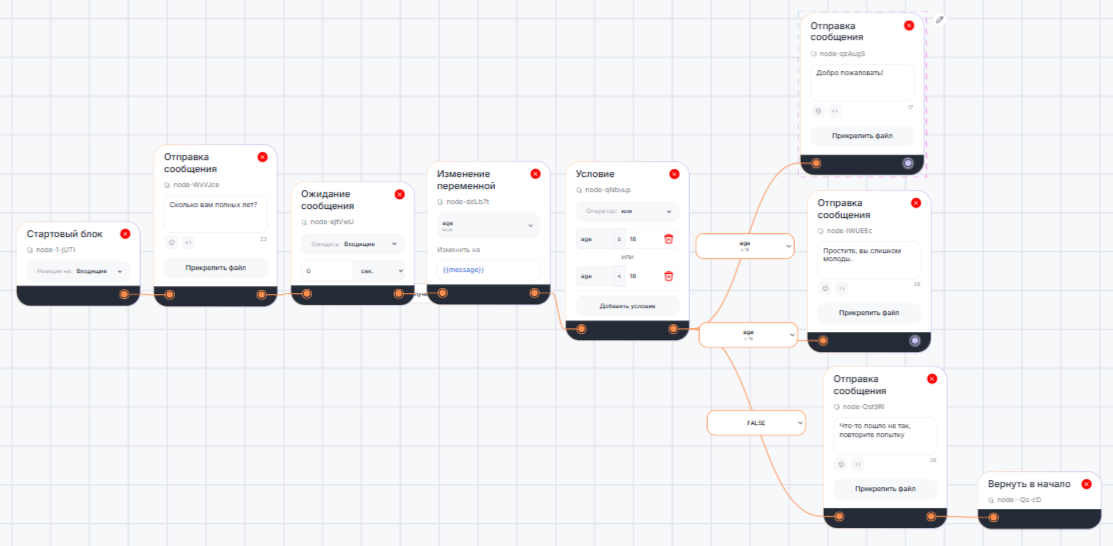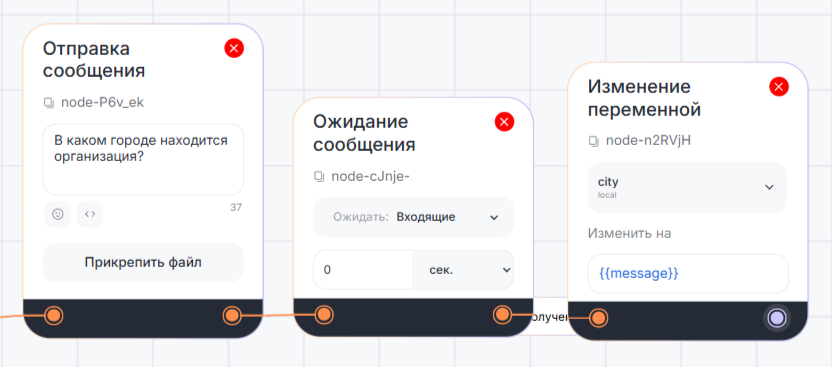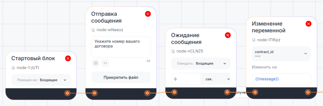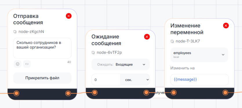 Переменная — это хранилище которое имеет название и содержит в себе значение. Используйте в сценарии переменные, чтобы создать уникальный персонализированный диалог для каждого клиента. Например, можно вписать системную переменную {{name}}, чтобы в процессе диалога на это место бот подставил имя из мессенджера. Если вы хотите использовать информацию о клиенте, которой нет в системных переменных, с помощью блока «Изменение переменной» можно подставить в созданную вами переменную значение, которое вам необходимо. Есть несколько вариантов, где это может быть полезно. 1. Универсальный шаблон сообщения Допустим, нам в диалоге нужна информация о клиенте — номер договора, количество сотрудников в организации и город, в котором он находится. 1) Мы создаем локальные переменные с названиями на латинице: contract_id, employees, city (вы можете придумать свои). 2) Создаем блок отправки сообщения и записываем в текст: «Подскажите номер вашего договора?». 3) Связываем его с блоком «Ожидать сообщения» и следом создаем «Изменение переменной». 4) Выбираем переменную, которую хотим изменить (contract_id). 5) В поле «Изменить на» вписываем {{message}}. Так бот подставит в значение переменной текст сообщения, которое отправит нам клиент. 6) Повторите это действие со всеми созданными переменными.   Теперь вы сможете использовать значения, которые бот запишет в эти переменные, когда клиент напишет сообщение. Пример: «Давайте все проверим. Компания находится в {{city}} и в ней работает  {{employees}} сотрудников. Номер вашего договора {{contract_id}}. Все верно?» 2. Изменение типа переменной У каждой переменной есть тип — «Строка», «Целое число», «Словарь» или «Список». От типа переменной зависит то, какие данные она может в себе хранить, и то, как к этой переменной будут относится другие блоки. Например, в блоке «Условие» нельзя проверить на больше или меньше переменную с типом значения «Строка», а целое число можно. 1) В процессе сценария создайте блок «Отправка сообщения», где запросите у клиента целое число. 2) Создайте блок «Ожидание сообщения», а затем «Изменение переменной». 3) Создайте локальную переменную с типом значения «Целое число» и придумайте ей название на латинице. 4) В блоке «Изменение переменной» выберите созданную переменную и в поле «Изменить на» впишите {{message}}. Так бот подставит в созданную переменную значение из сообщения клиента и вы сможете проверить ее в блоке «Условие».
