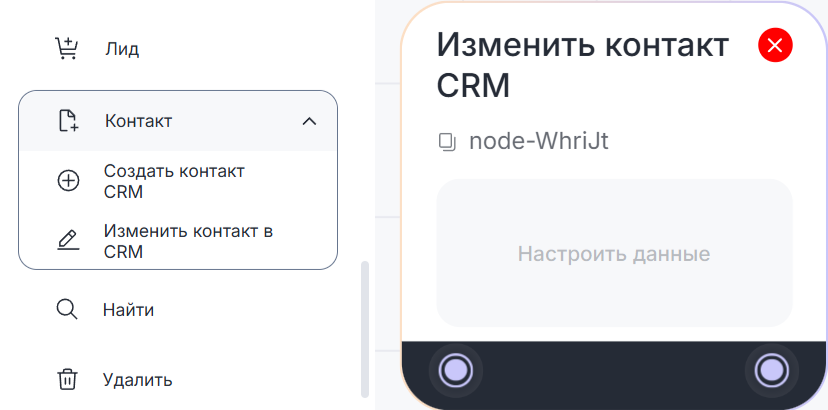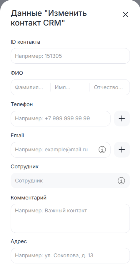 | Важно: блок «Изменить контакт CRM» только изменяет элемент, он не может проверить наличие такого контакта в CRM. | |