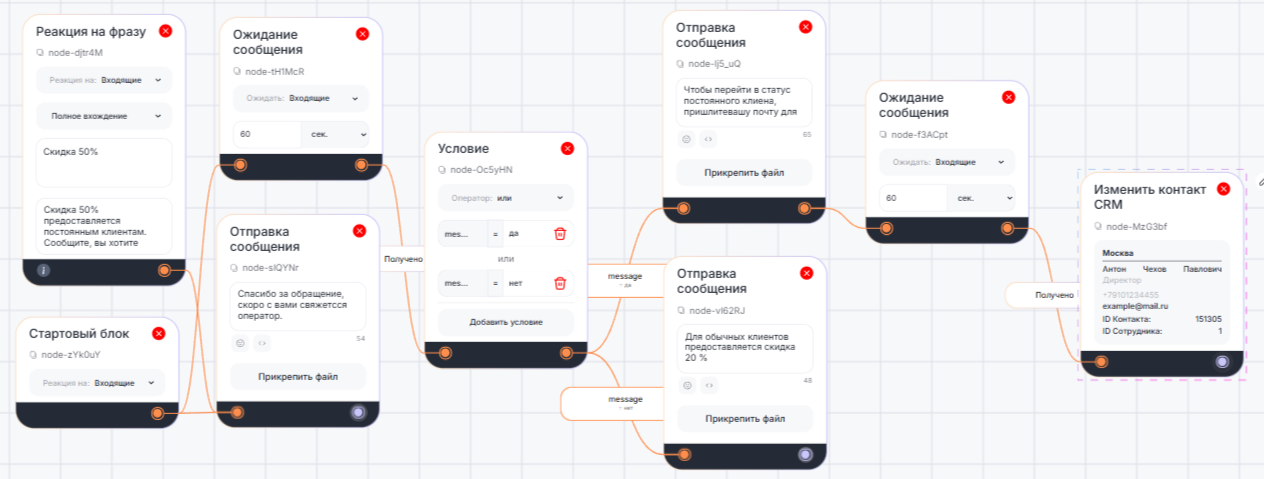 - Если клиент не хочет стать постоянным, бот предлагает скидку 20%.