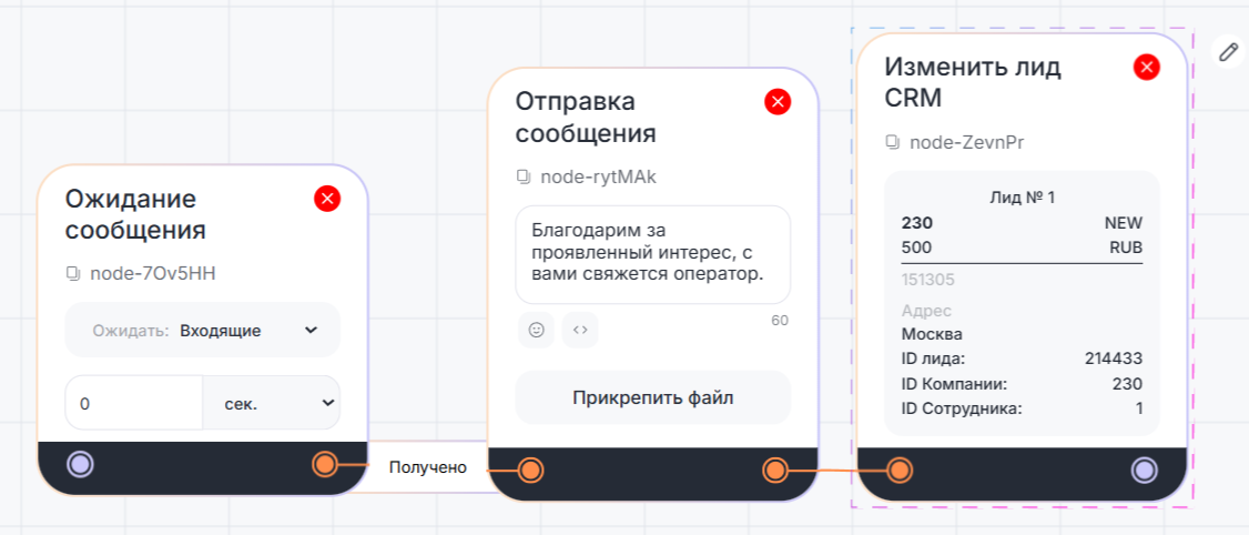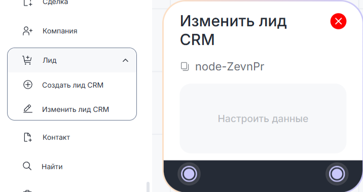 В диалоге бота с клиентом блок «Изменить компанию CRM» автоматически меняет данные компании. Блок работает только с Битрикс24.| Важно: блок «Изменить лид CRM» только изменяет элемент, он не может проверить наличие лида в CRM-системе. | |
