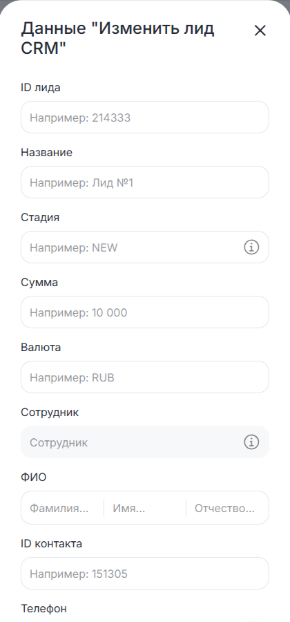 3. В открывшемся окне введите данные лида, которые нужно изменить. В поля можно добавить переменные. Подробнее о создании переменных читайте в статье "Переменные и константы".